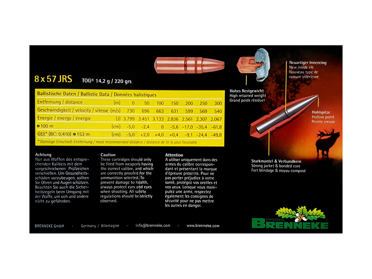 Ak hľadáte strelivo, ktoré ani pri náročnom love nesklame, TOG® od BRENNEKE je tou správnou voľbou. Sú navrhnuté tak, aby sa pri náraze spoľahlivo roztiahli a pritom nestratili zo svojej hmotnosti. Vďaka svojej jedinečnej štruktúre, kombinácii osvedčených prvkov a inovatívnych vylepšení ponúka TOG® kombináciu predtým nedosiahnuteľných výkonnostných charakteristík ako: vynikajúca presnosť, veľmi dobré vlastnosti pri streľbe na veľké vzdialenosti, veľmi vysoká penetračnú sila, menšia deštrukcia zveriny, vysoká zostatková hmotnosť (cca 90%). Vhodné pre poľovníkov, ktorí ocenia univerzálnu guľku s vysokou zostatkovou hmotnosťou, dobrou presnosťou, účinnosťou.