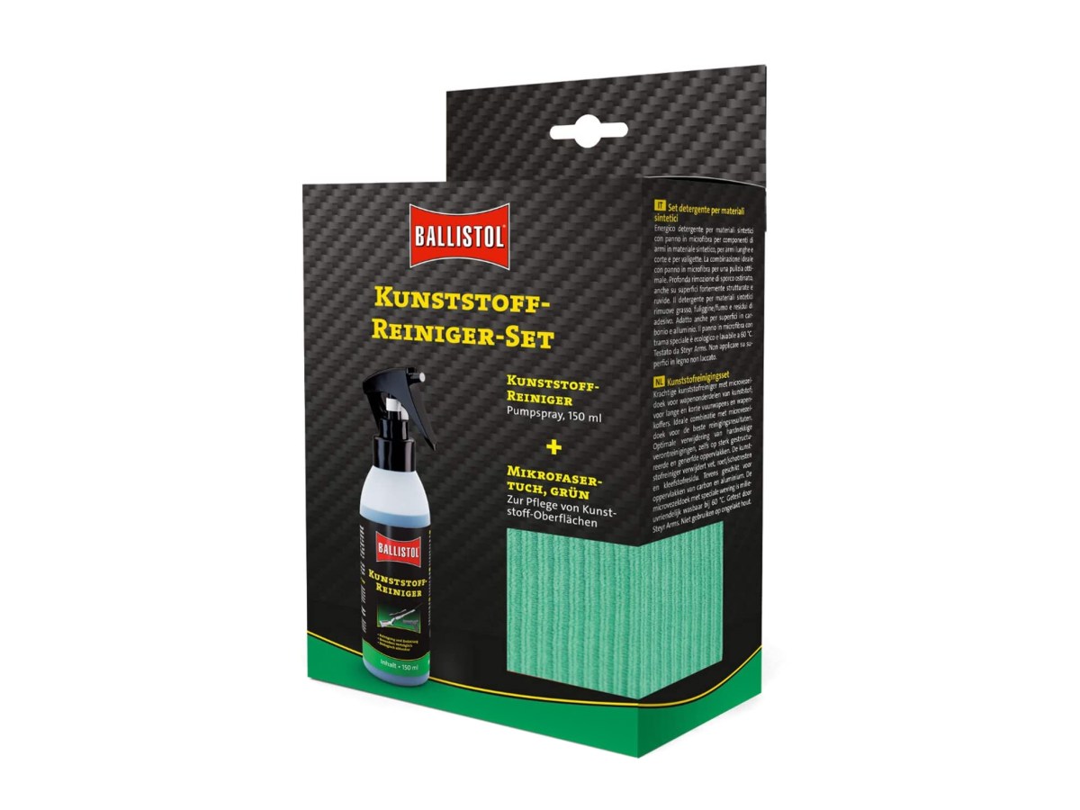 Čistiaca sada je ideálna na čistenie plastových dielov na zbraniach, puzdách a batohoch. Špeciálny čistič plastov Ballistol odstraňuje aj zažratú špinu, mastnotu, sadze, pot, dym ako aj zvyšky lepidla. Spolu s utierkou na plasty z mikrovlákna je táto sada neprekonateľným nástrojom na čistenie citlivých plastových povrchov. Obsahuje 150 ml tekutého prípravku v spreji s pumpičkou a hanričku z mikrovlákna.