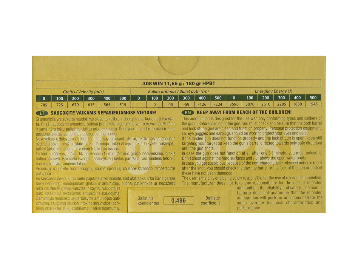 Najmenšie balenie 20 ks. Úsťová rýchlosť 785 m/s, úsťová energia 3590 J (hlaveň 60 cm).
