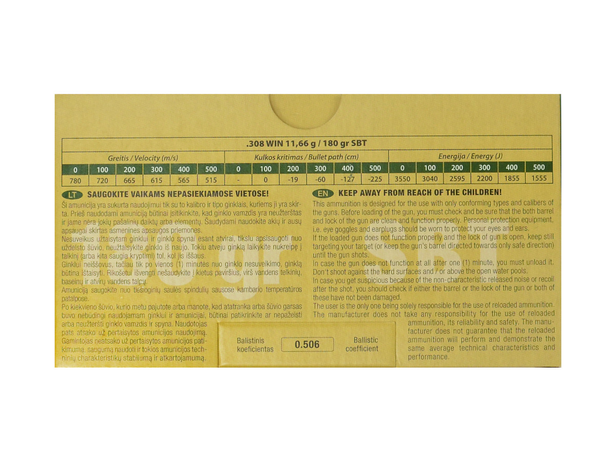 Najmenšie balenie 20 ks. Úsťová rýchlosť 780 m/s, úsťová energia 3550 J (hlaveň 60 cm).