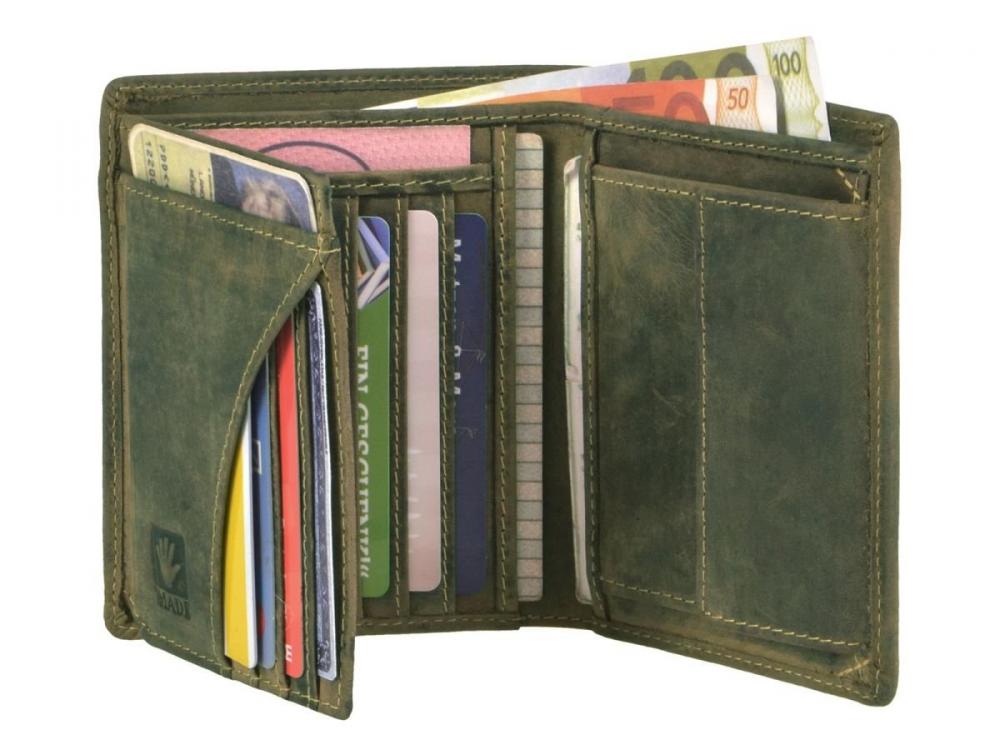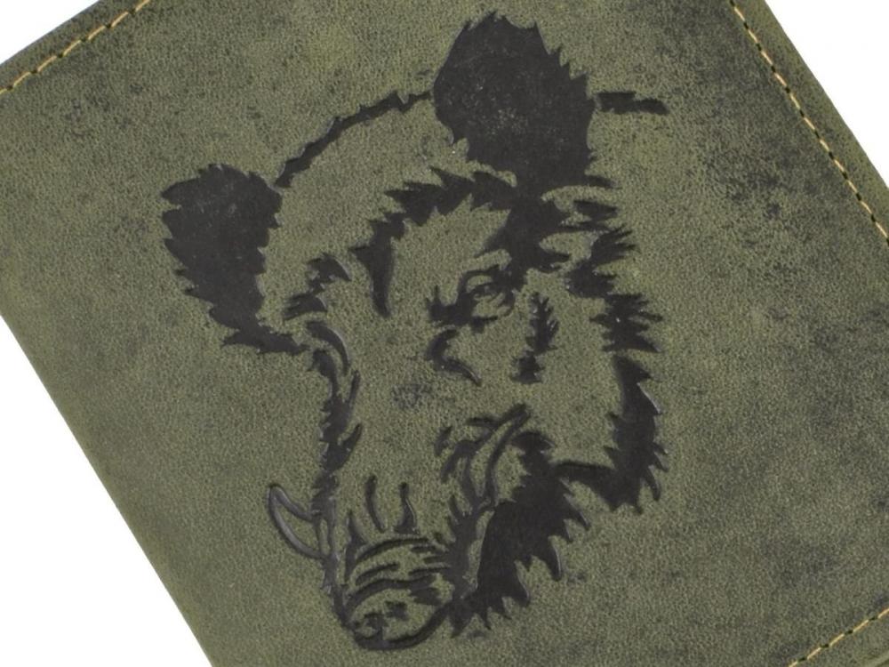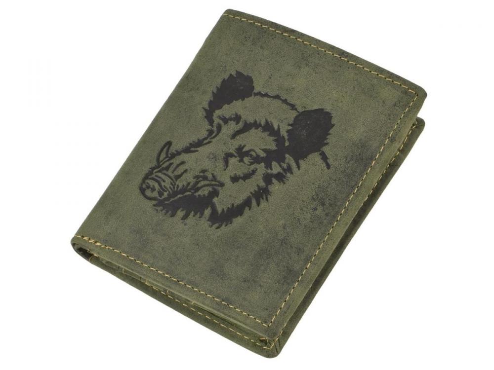 Pánska peňaženka z kvalitnej brúsenej kože Greenburry 9,5x12cm s razbou diviaka. Ručná výroba. Farba zelená.
