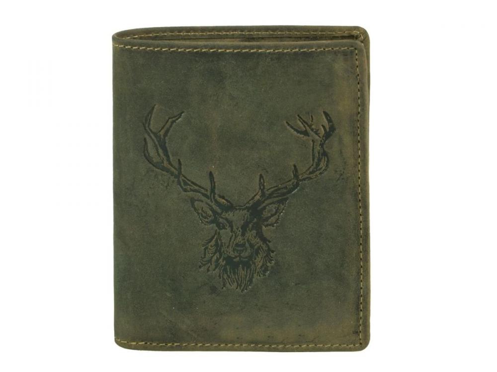 Pánska peňaženka z kvalitnej brúsenej kože Greenburry 9,5x12cm s razbou jeleňa. Ručná výroba. Farba zelená.