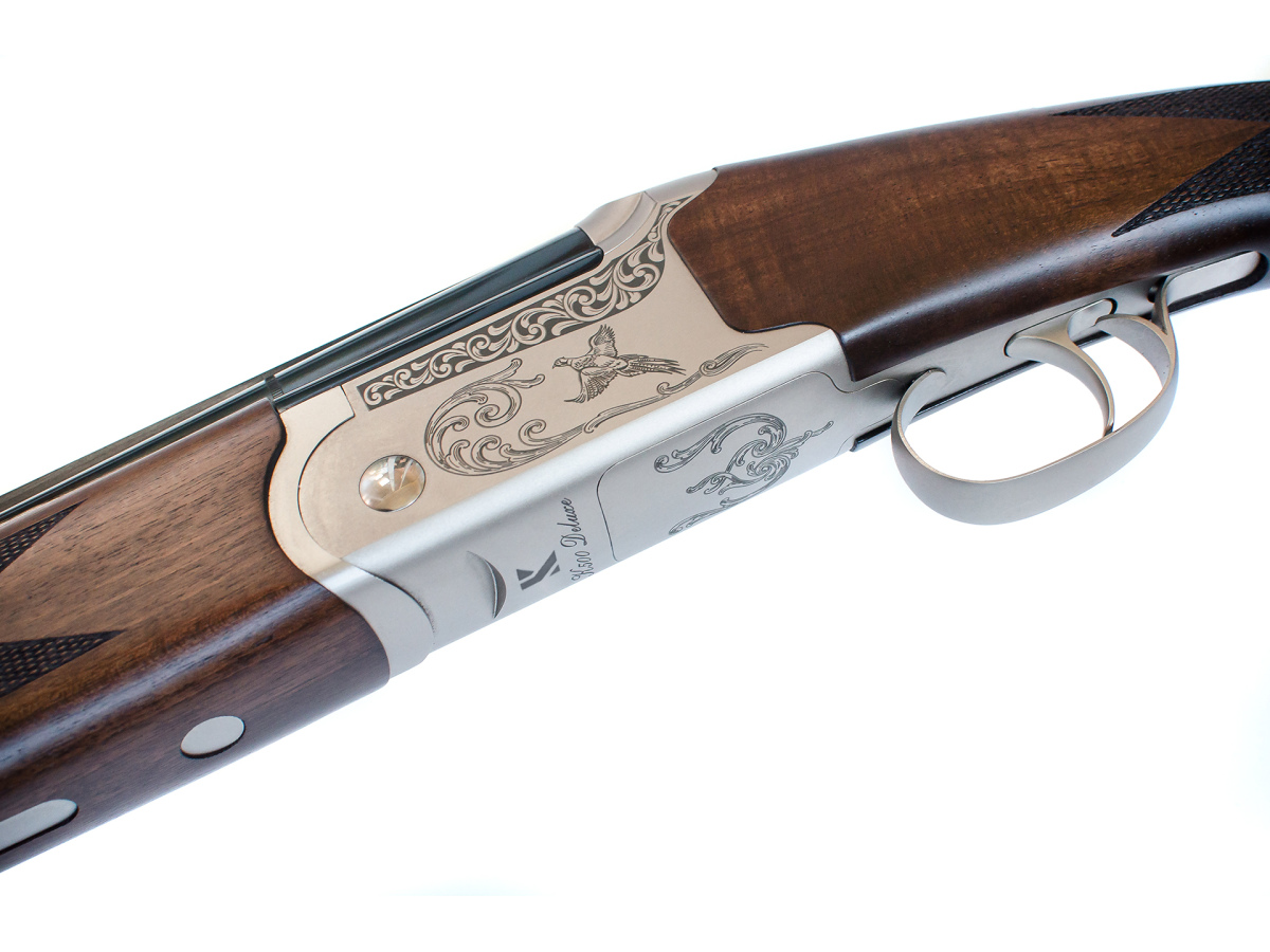 Dvojhlavňová brokovnica Khan Arms K-005 Deluxe s pažbou z tureckého orecha a baskulou z kovanej ocele s ozdobným gravírovaným. Muška s červeným svetlovodivím vláknom. 3" komora, selektor hlavní, vyhadzovač a pútka na remeň. 5 vnútorných čokov v balení.