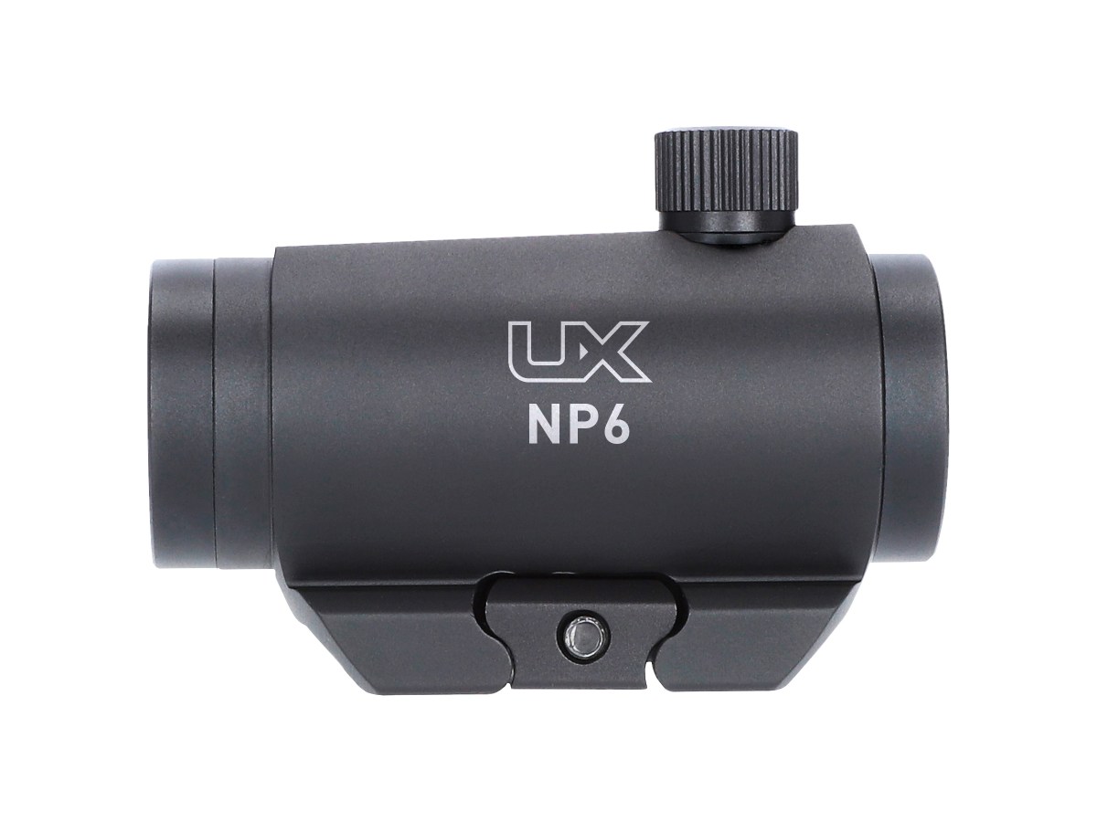 Kolimátor UX NP 6 (Nano Point 6) s kompletne zakrytým kompaktným tubusom so zameriavacím bodom veľkosti 6 MOA s možnosťou voľby červenej alebo zelenej farby. Regulácia intenzity podsvietenia zámerného bodu v 5-tich stupňoch pomocou kolieska na bočnej strane. Bod je možné nastavovať horizontálne aj vertikálne. Integrovaná montáž na picatinny lištu 22 mm. Paralaxa 10 m. Odolnosť proti spätnému rázu max. kal. .22 LR.