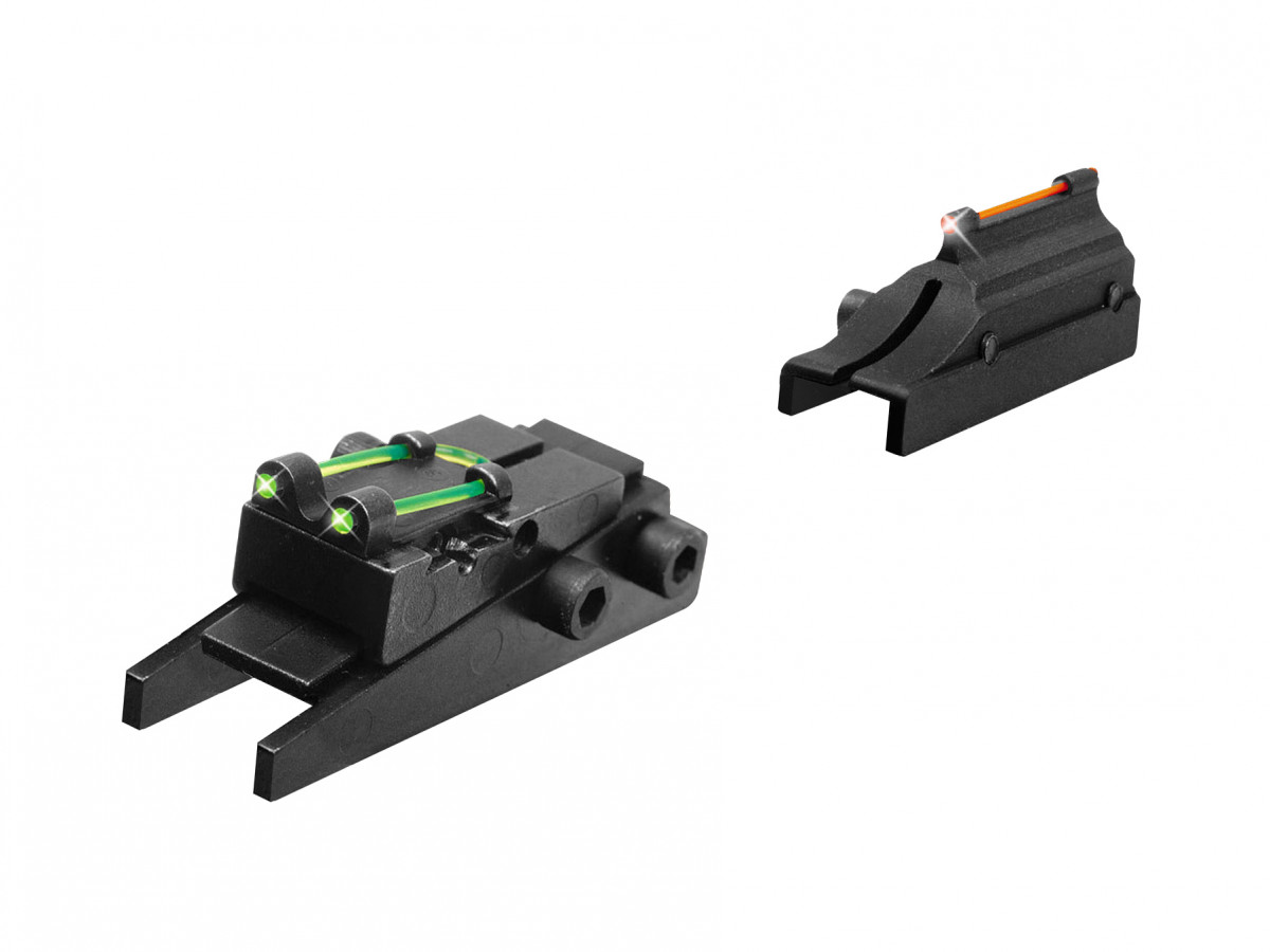 TG944D – svetlovodné mieridlá na brokovnicu s lištou, vhodné pre modely: Benelli Super Black Eagle/M1/Nova, Browning BPS/A-5, Ruger Red Label, Stoeger Model 2000 a modely Savage. Celokovové, plne nastaviteľné. Rozdiel oproti hlavnému obrázku: cieľnik obsahuje dve rovné zelené vlákna, nie jedno zahnuté.