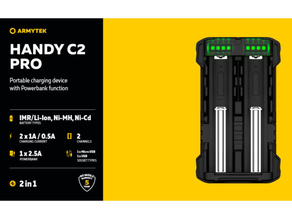 Armytek Handy C4 Pro (typ C) je univerzálna nabíjačka s funkciou powerbanky, umožňuje z nabitých batérií nabíjať iné zariadenia. Nabíja súčasne až 4 batérie rôznych typov prúdom max. 1A. Podporuje IMR / Li-Ion, NI-MH a Ni-Cd batérie s priemerom 8-19 mm a dĺžkou 30-70 mm, napríklad: AA, AAA, AAAA, 10440, 14500, 16340, 18350, 18650. Viacfarebná LED indikácia s piatimi informačnými LED-kami na kanál. Automatická detekcia optimálneho nabíjacieho prúdu, typu batérie, úrovne nabitia a automatické ukončenie nabíjania.