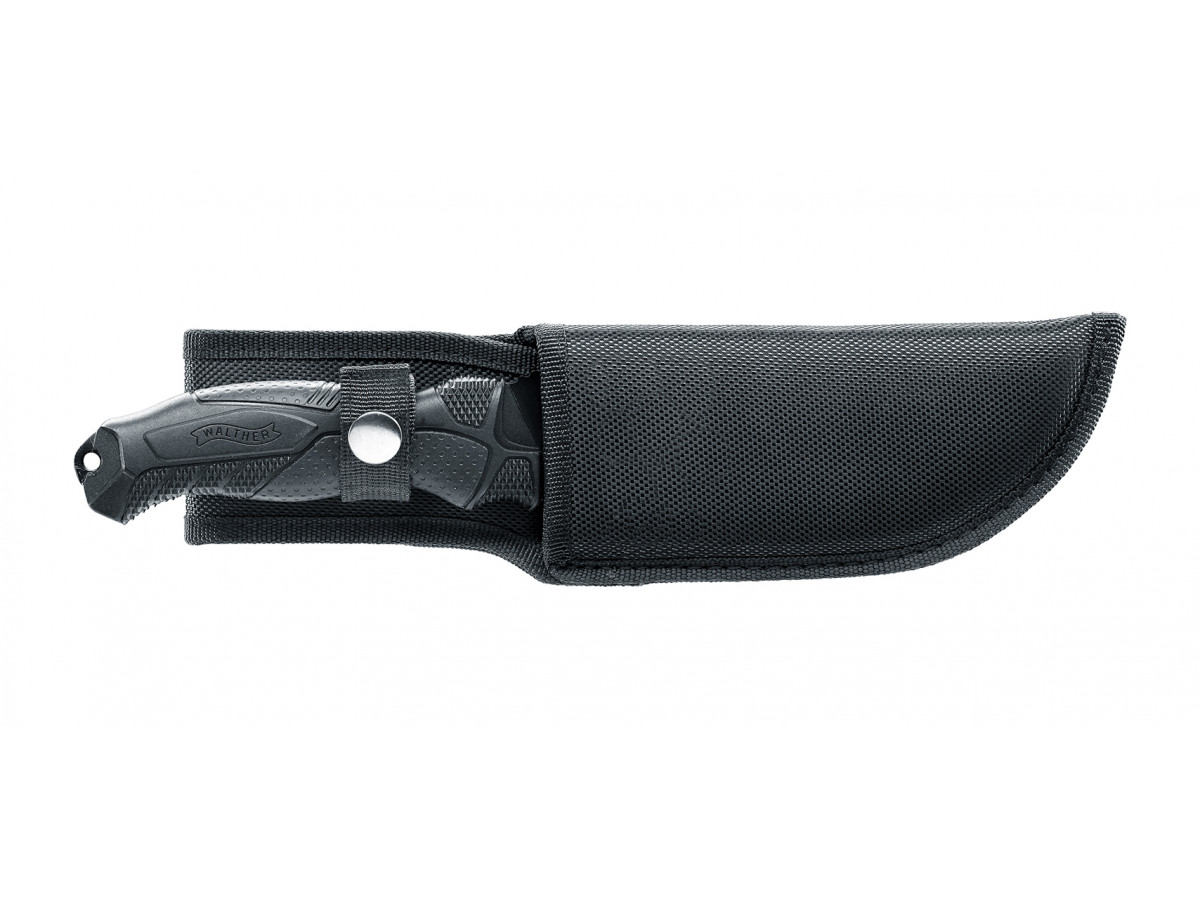 Walther OSK I (Outdoor Survival Knife), čierna čepeľ, oceľ 440A, celková dĺžka 280 mm, dĺžka čepele 147 mm, hmotnosť 290 g, nylonové puzdro Walther na opasok.