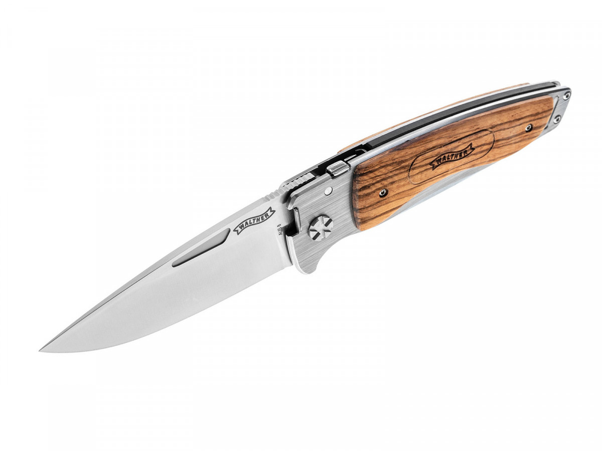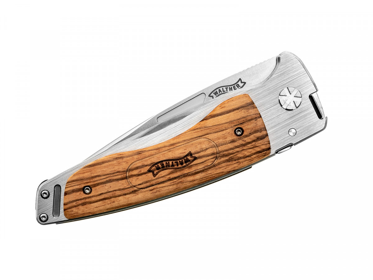Walther Traditional Folder Wood 3 – dĺžka čepele 95 mm, celková dĺžka 228 mm, oceľ: AUS 8, rukoväť: drevo "Zebra", hmotnosť 218 g. Hnedé kožené puzdro na opasok.