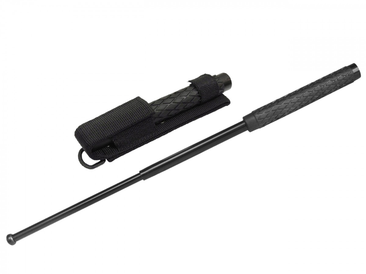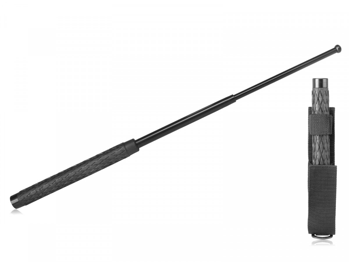 Dlhý teleskopický obušok oceľový – dĺžka 653 mm, zložený 250 mm, hmotnosť 660 g, pogumovaná rukoväť, čierne puzdro na opasok. Dlhšia rukoväť umožňuje obojručné držanie.