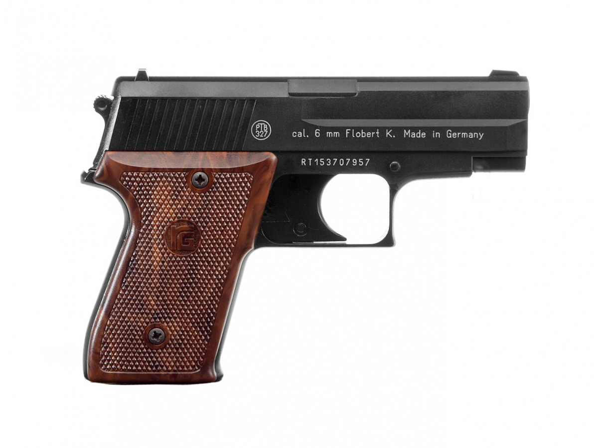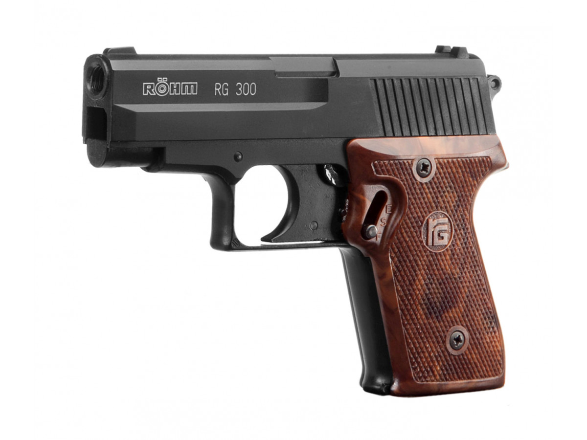 Expanzná (štartovacia a plynová) pištoľ Röhm RG 300. Vďaka slabšiemu kalibru vytvára menší akustický tlak, takže je vhodná aj výcvik psov a športové podujatia. Čierna farba, kovový záver a rám, hnedé plastové pažbičky, kal. 6mm Flobert, kapacita 10 nábojok, dĺžka 144 mm, hmotnosť 465 g.