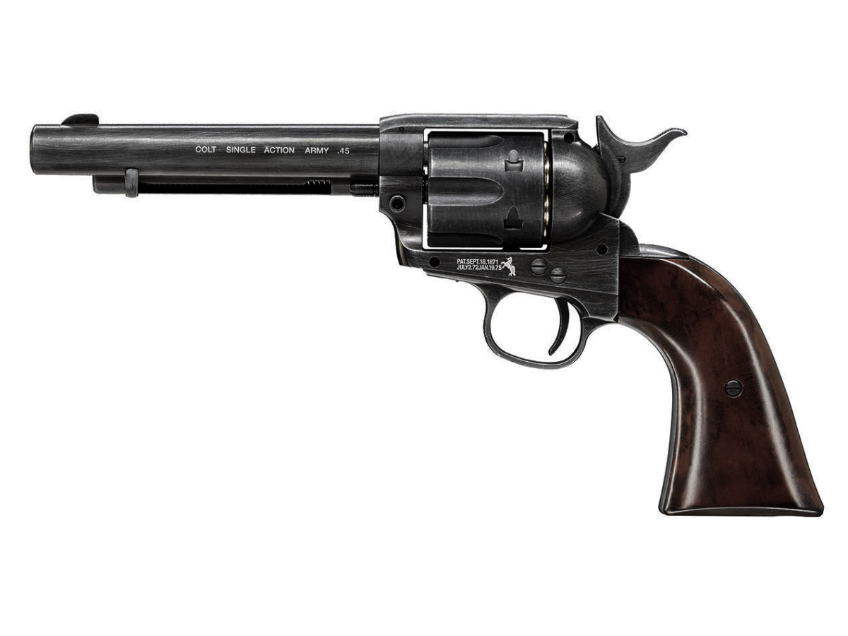 Revolver CO2 Colt SAA .45-5.5" antique, kal. 4,5mm diab. je autentická replika westernového Peacemaker nielen pre milovníkov histórie. Krásna celokovová konštrukcia vzduchového revolvera s povrchovou úpravou antique je doplnená rukoväťou s lesklou plastovou rúčkou v dekore dreva. Presná drážkovaná hlaveň, kvalitné spracovanie, realistické nabíjanie nábojnicami do komôr valca a priaznivá cena. Diabolka sa vkladá do atrapy náboja.